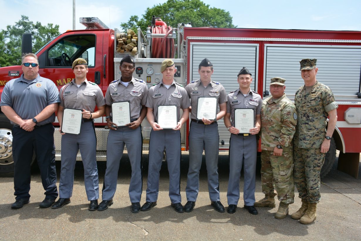 In May, MMI celebrated another milestone with its Alabama Fire College (AFC) partnership: recognizing its first firefighter contingent (5 individuals) to be certified at the volunteer level along with two EMT-certified students. In attendance was AFC’s Jeff Roberts, Region 5 Coordinator, who congratulated the group in front of the entire Corps of Cadets. Since launching its first responder program in Fall 2017, MMI has been offering cadets the option to take firefighting and EMT courses through Tuscaloosa-based AFC as an extracurricular program. Cadets choose the course(s) pathway appropriate to their objective and are provided with a dedicated AFC instructor teaching night classes in Marion, necessary equipment, and skills tests conducted on the AFC campus.