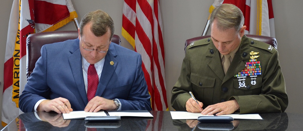 AFC’s Mr. Rice and MMI’s Col. Mollahan sign an agreement between the two colleges, signaling a courses partnership.